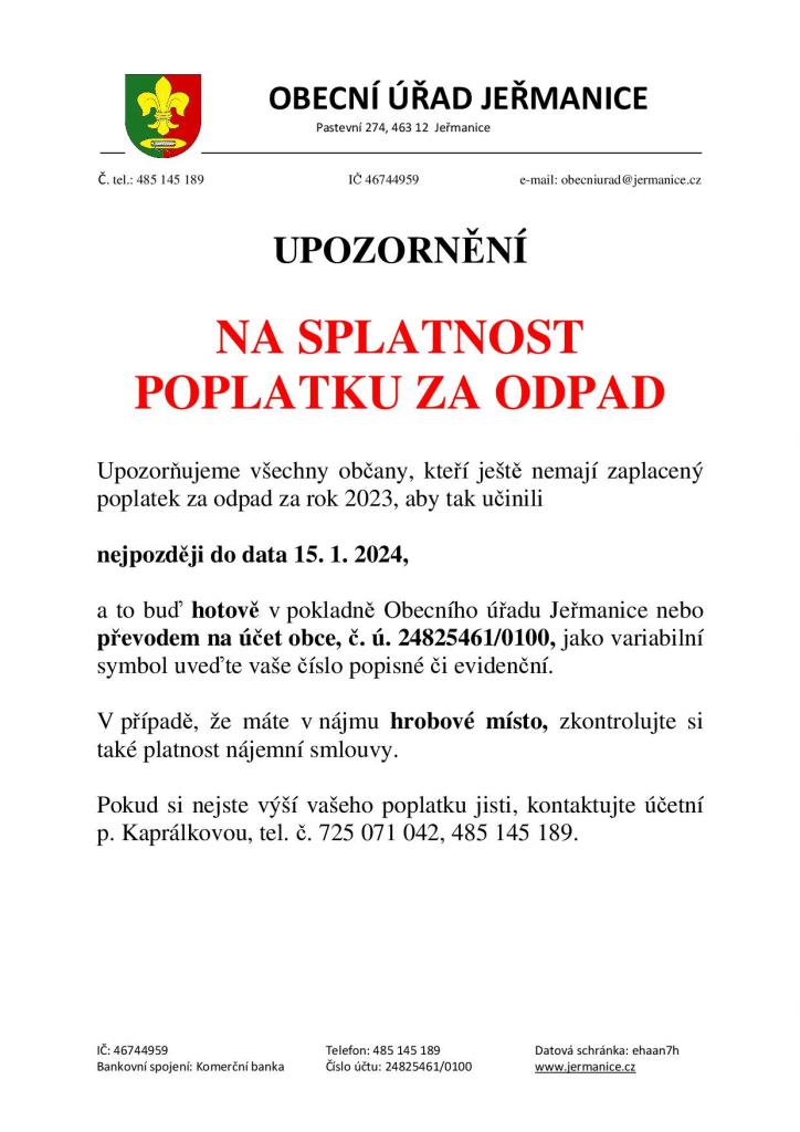 Upozorňujeme, že splatnost poplatku za odpad za rok 2023 je do 15. 1. 2024.