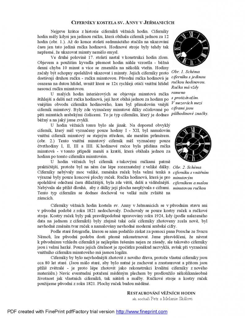Věžní hodiny na kostele sv. Anny v Jeřmanicích zrestaurovali v letech 2003-2004 akad. sochaři Petr a Melanie Skálovi. Před zrestaurováním hodiny připomínaly spíš hromádku šrotu. Stroj byl kompletně zrestaurován, ciferníky a ručičky byly vyrobeny nové. V roce 2020 došlo k obnově ciferníků, kdy se bílá barva z číslic oloupala, ciferníky byly demontovány a číslice obnoveny. Obnovu provedli akad. sochaři Petr Skála a Jan Marek.